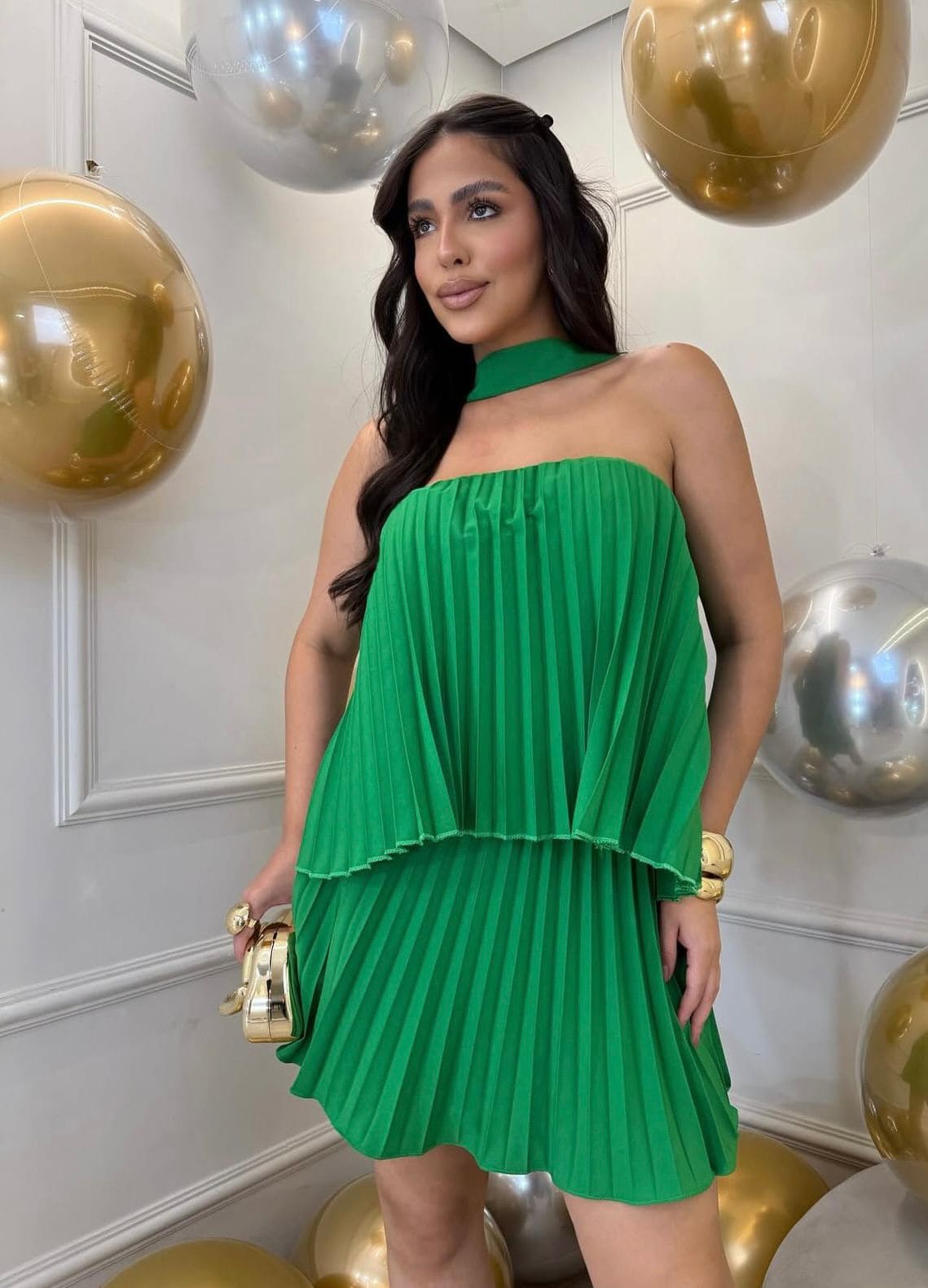 - modelo composto por um cropped tomara que caia e um shorts saia;