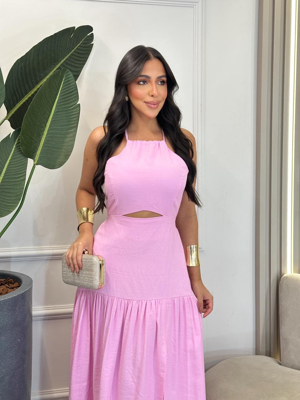Vestido midi amarração nas costas rosa Ravilla